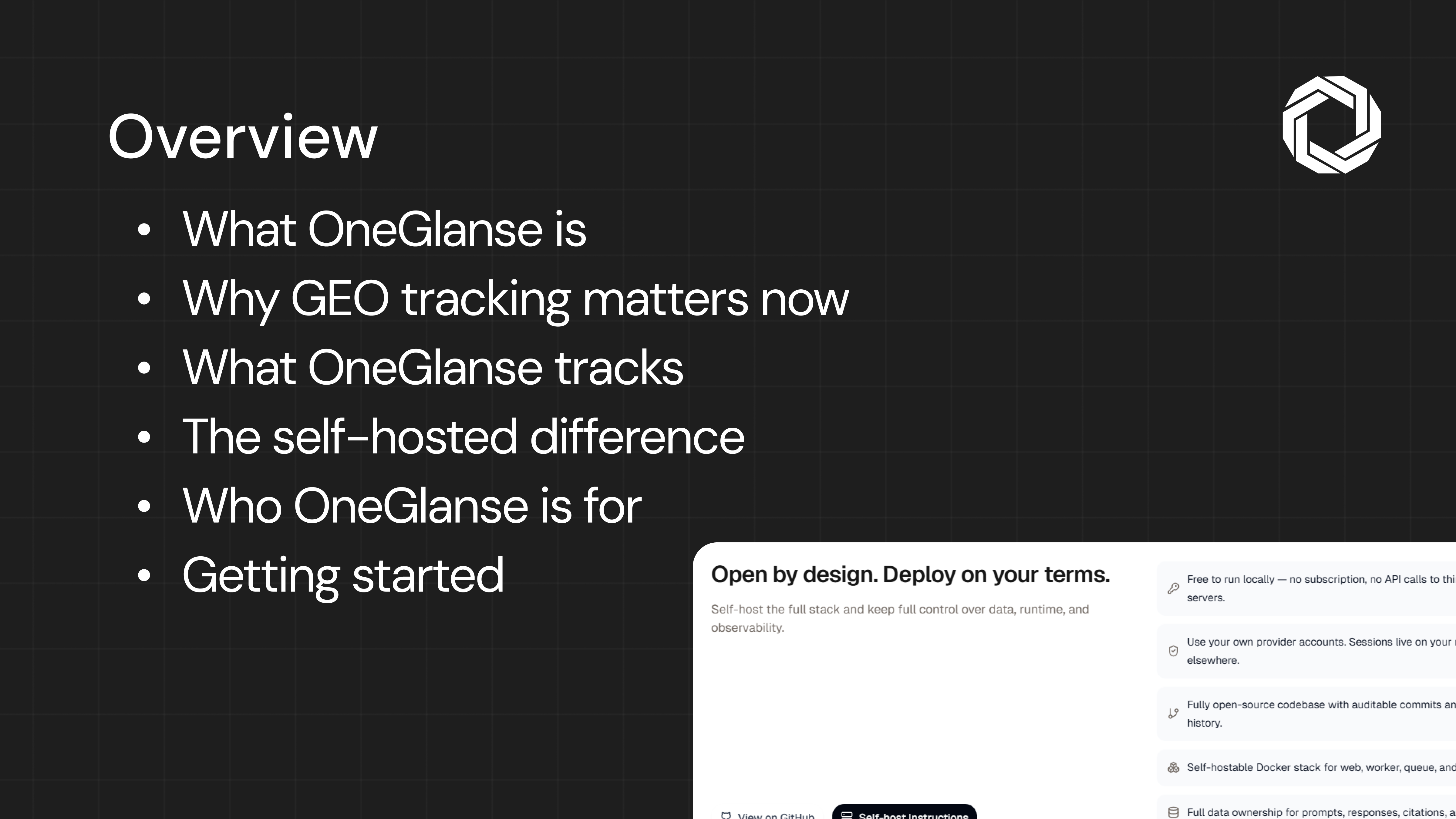OneGlanse is a free, open-source Generative Engine Optimization tracker that monitors how your brand appears in AI-generated responses across ChatGPT, Gemini, Perplexity, Claude, and Google AI Overview, with no subscriptions, no opaque scoring, and no data leaving your control.