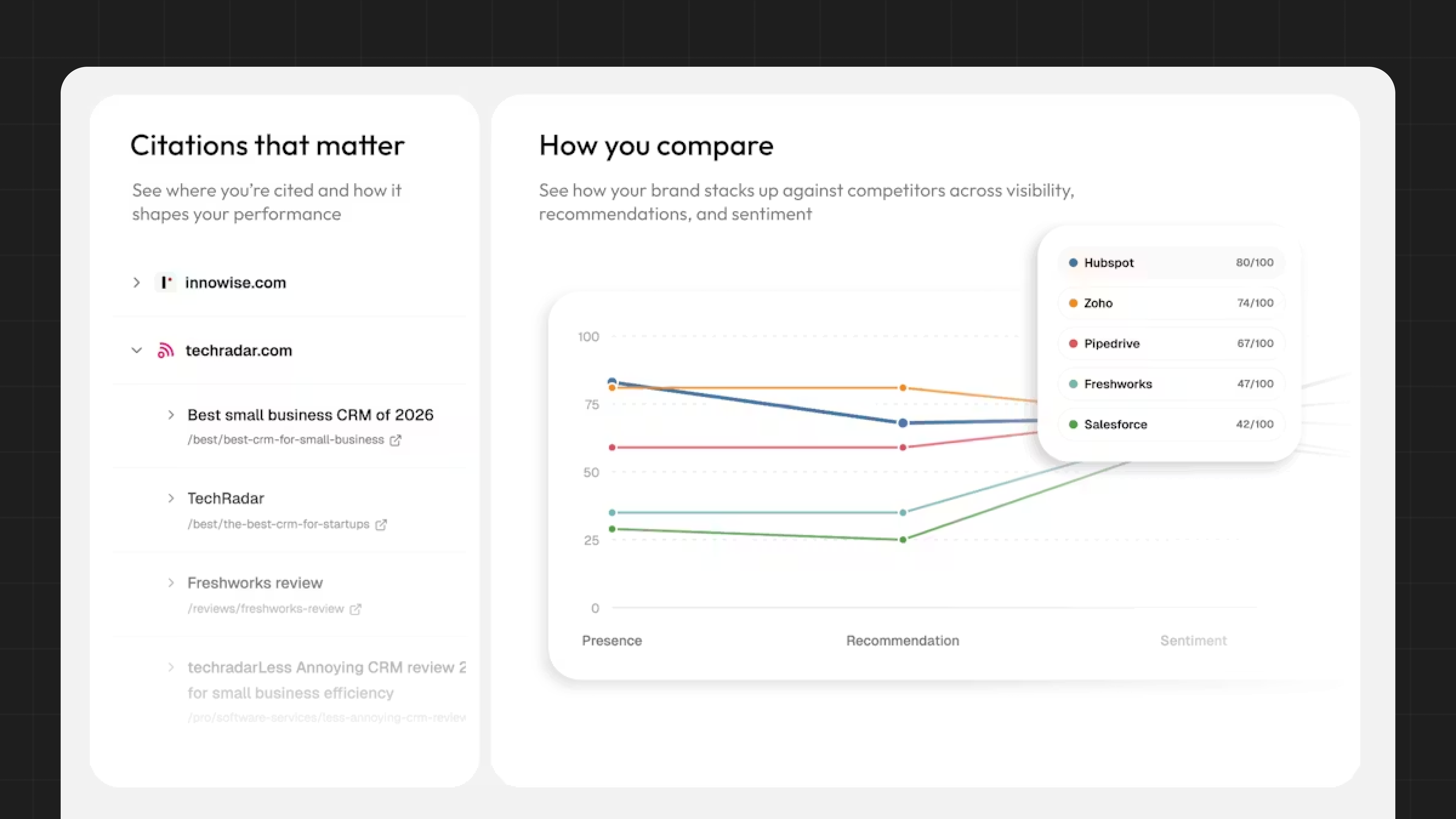 Competitor comparison lets you run the same queries and see how your brand’s presence stacks up against named competitors in the same AI response. This is particularly valuable for understanding category positioning, whether your brand appears alongside, above, or absent from the set of options an AI recommends.