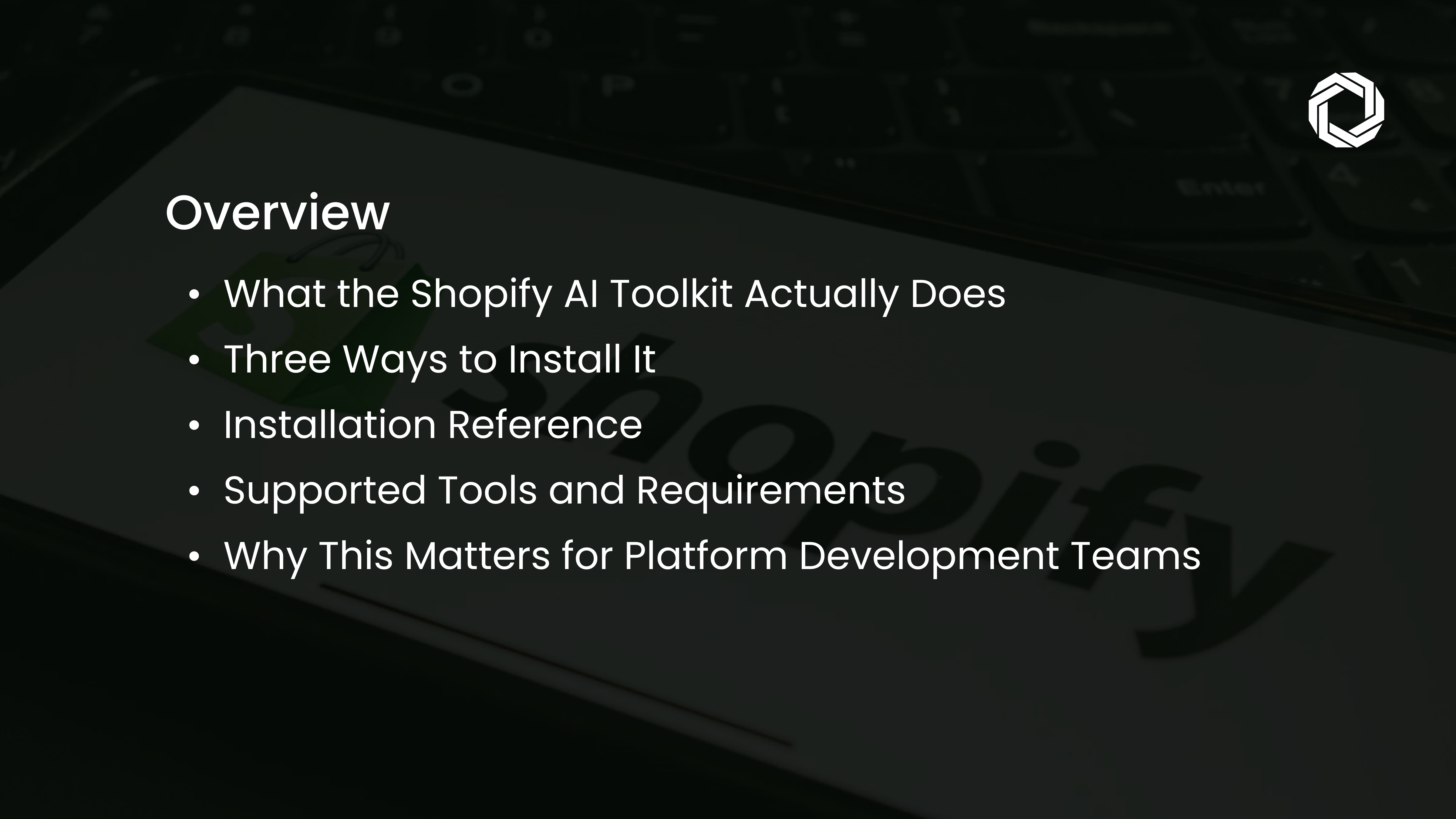 One of the persistent failure modes of AI-assisted development on platform APIs is context drift; the model generates plausible-looking code that does not reflect how the platform actually works. It guesses at endpoint structures, invents parameters, and produces implementations that require significant manual correction before they are production-safe. The Shopify AI Toolkit addresses this directly. By connecting AI coding tools to Shopify's actual documentation, API schemas, and code validation layer, it gives agents the authoritative context they need to generate correct implementations rather than educated guesses. This post covers what the Toolkit does, the three ways to install it, and which approach makes sense depending on your team's setup.